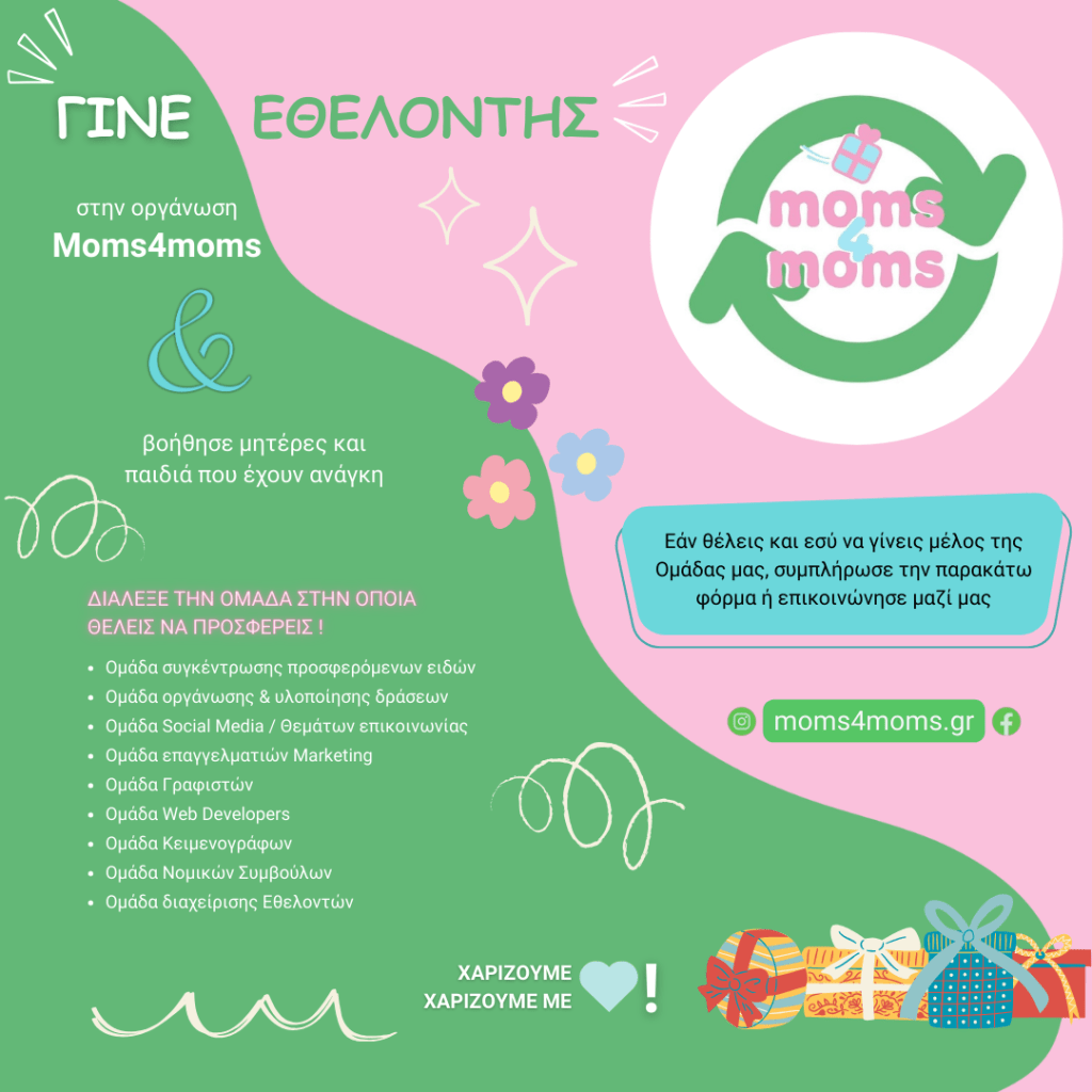 Ως Εθελοντής της Οργάνωσης “Moms4moms” έχεις την ευκαιρία να συμμετέχεις σε μία ή περισσότερες από τις παρακάτω ομάδες της επιλογής σου.